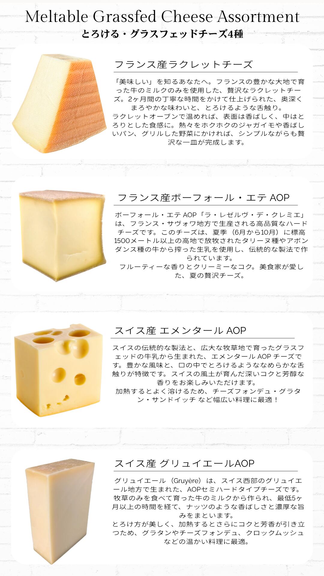 すべてグラスフェッドミルクを使用し、チーズフォンデュやグラタン、パン料理などの加熱調理に最適。
