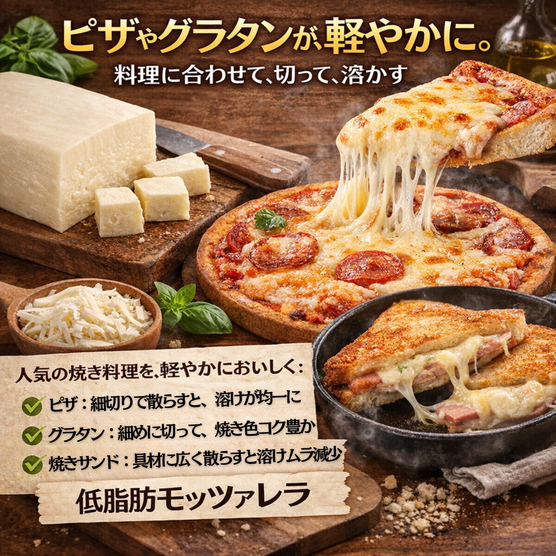 トーストには薄切りでのせ、表面がとろりとまとまるまで軽く焼くと、朝の食卓が心地よく整います。グラタンや焼き料理では、表面用と中に混ぜる用で切り方を変えることで、重くなりすぎない仕上がりに。ピザに使うなら細切りにして散らすと、トマトや野菜の風味を邪魔せず、全体を軽やかにまとめてくれます。