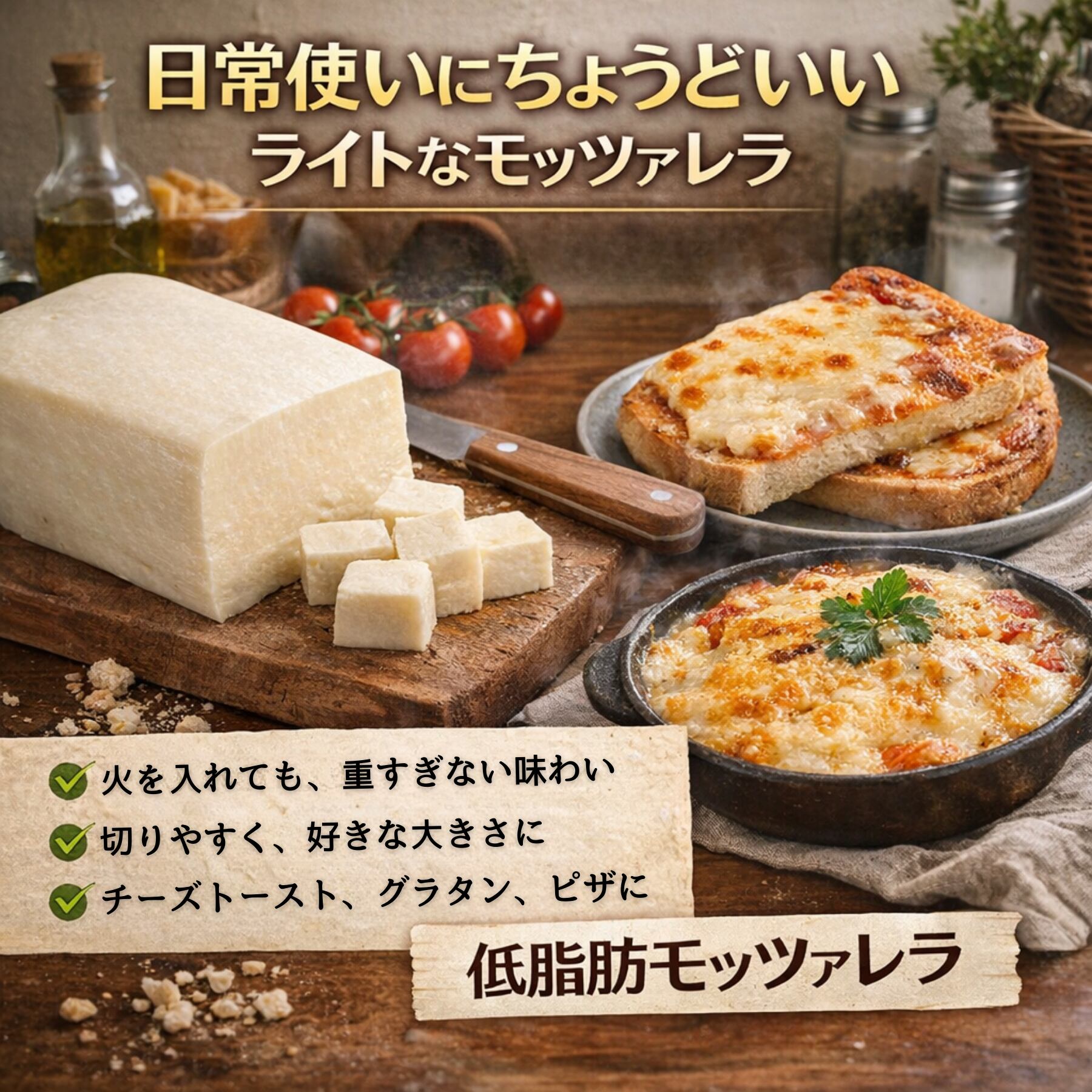 チーズの存在感を出しすぎず、 仕上がりを軽くまとめたい場面に使いやすいタイプ。 低脂肪で、たんぱく質やカルシウムも含み、日常使いしやすいモッツァレラです。