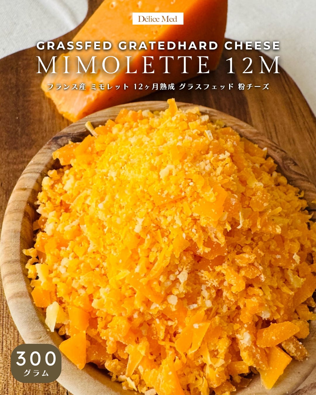 パスタ・グラタン仕上げ用 粉末チーズ 300g|フランス産 ミモレット12ヶ月熟成 グラスフェッド【DELICEMED】 Mimolette 12M Grassfed Grated Cheese for Cooking
