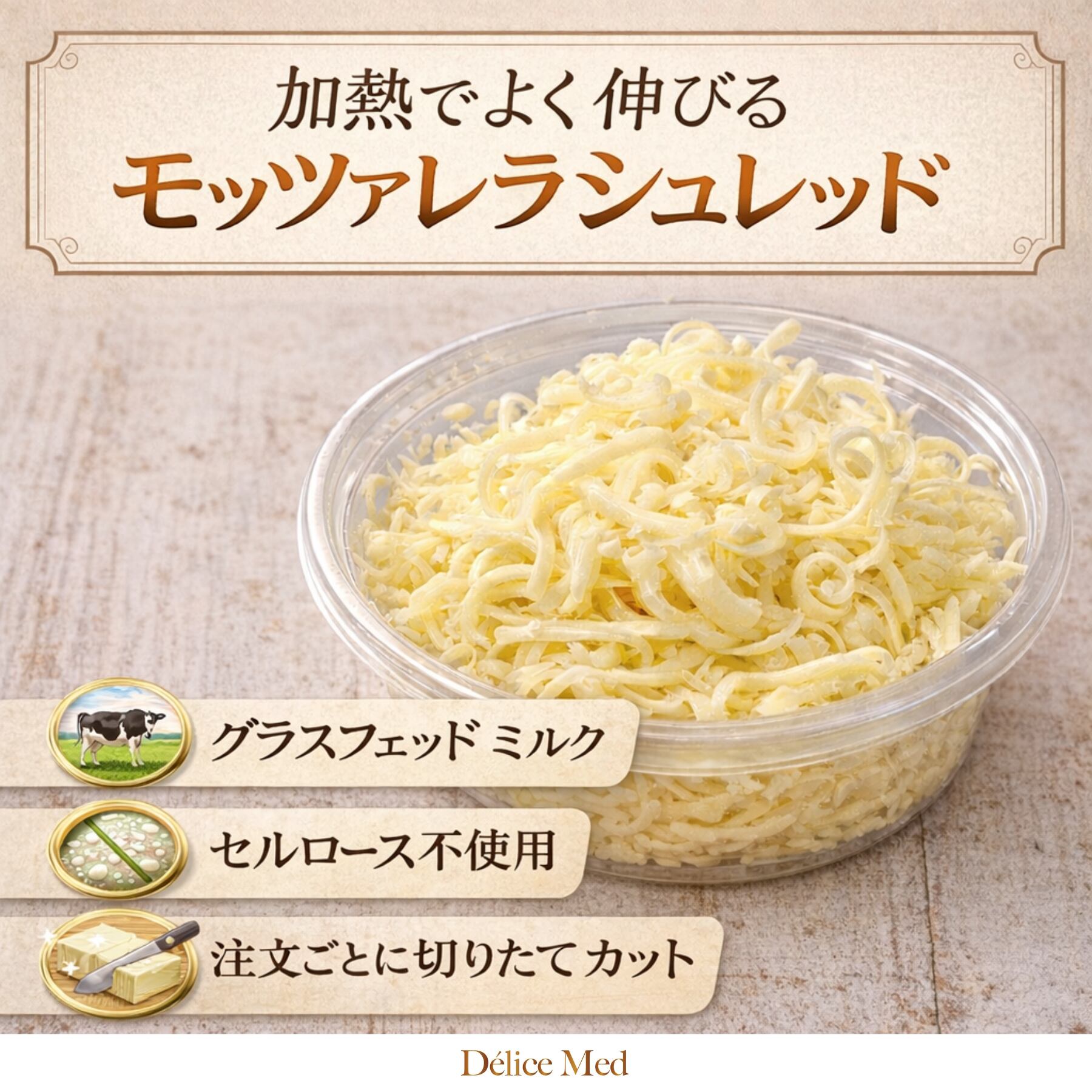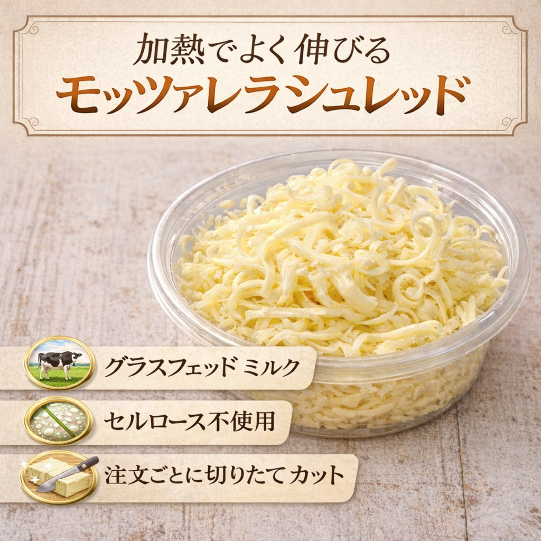 余計な添加物を使わないナチュラルチーズ。シュレッドでも粉落ちしにくい仕上がりです。