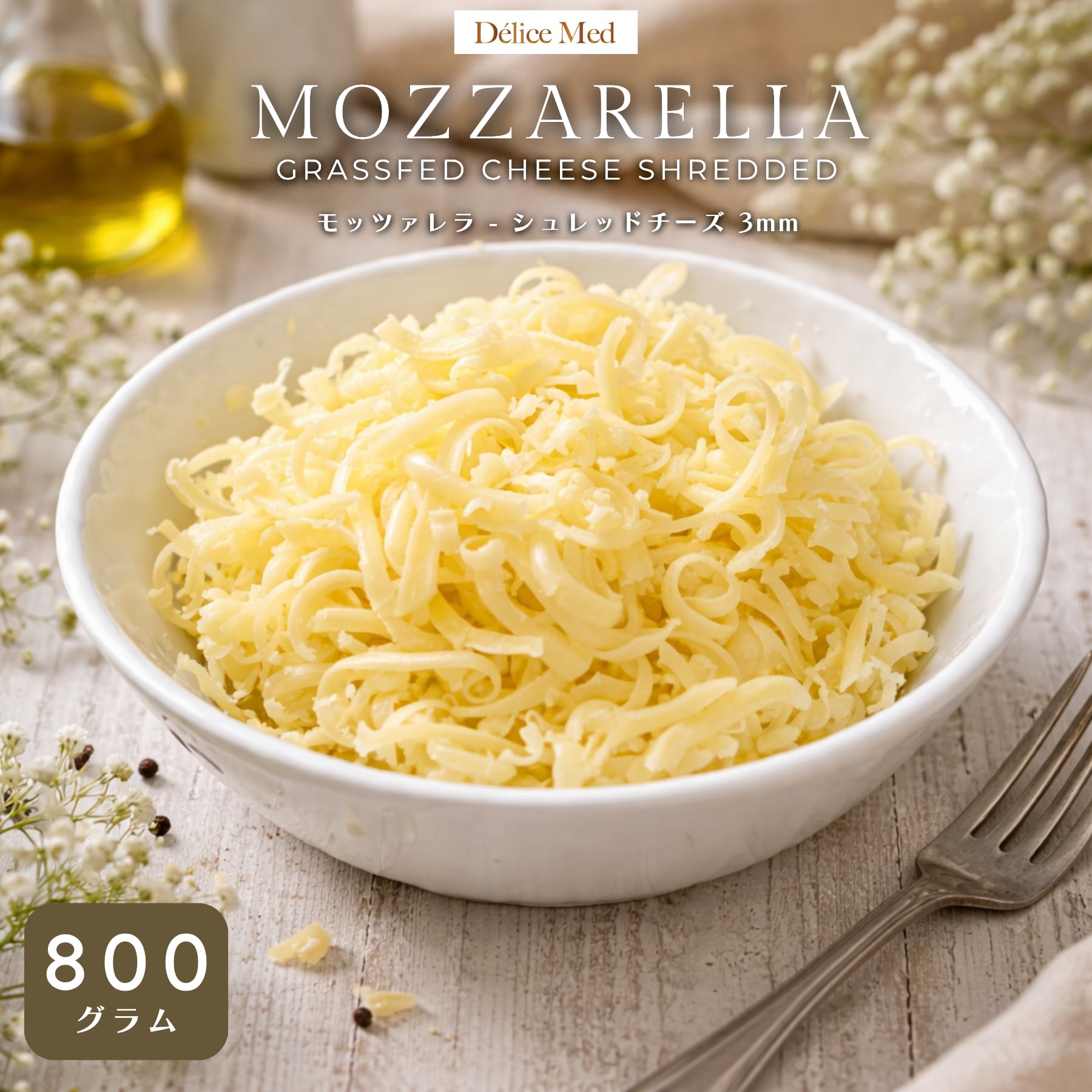 モッツァレラ チーズ シュレッド 800g 3mm|切りたて・セミハード・グラスフェッド・無添加・セルロース不使用|ピザ・グラタンに最適|Semi-Hard Grassfed Mozzarella Shredded Chees