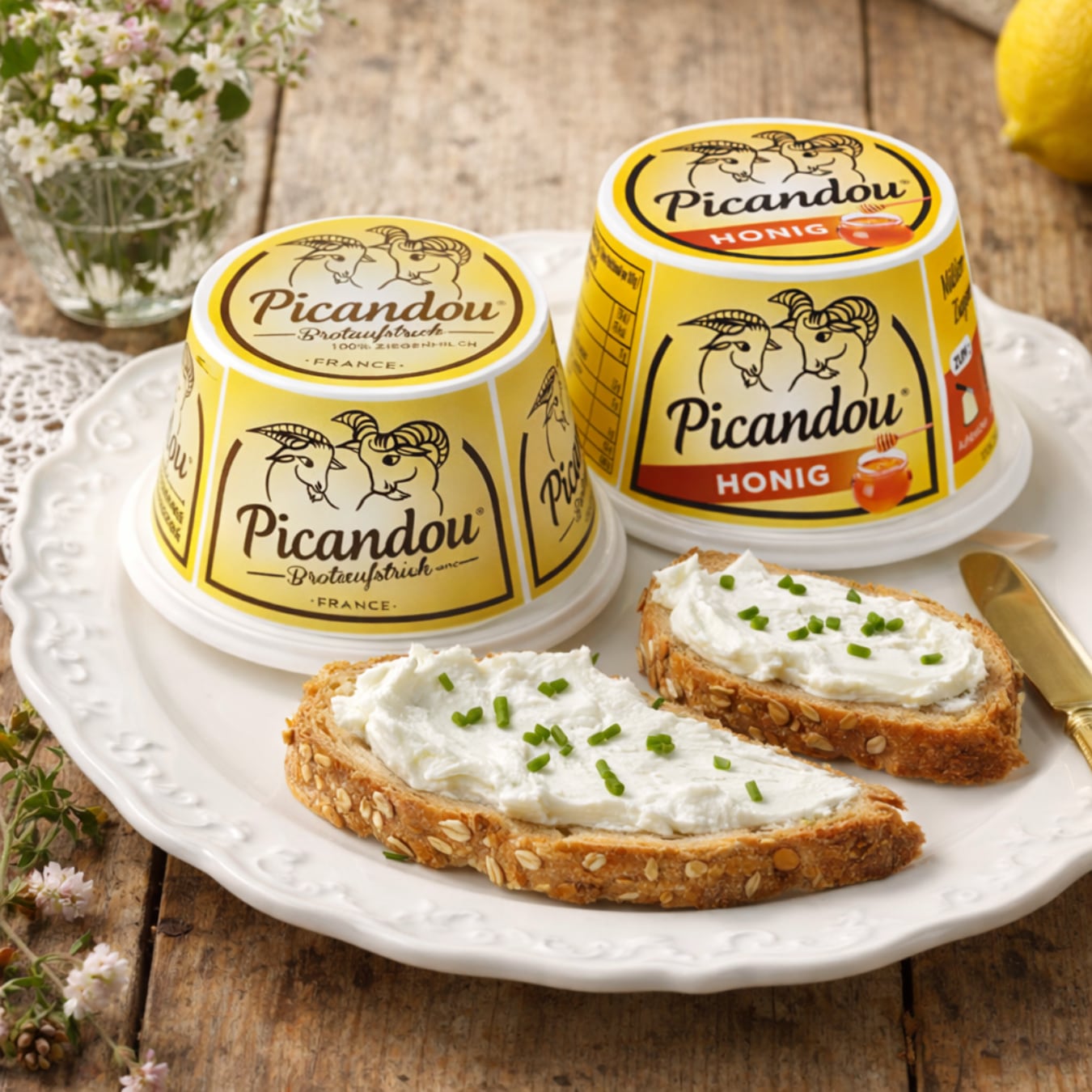 セットの「ピカンドゥ はちみつ」は、クリーミーなゴートチーズに蜂蜜のやさしい甘みを重ねたタイプ。りんご、いちじく、ナッツ、くるみパンなどと合わせると、甘みとコクのバランスが引き立ち、軽食や前菜がぐっと印象的に仕上がります。朝のトーストに塗るだけでも、いつもの朝食が少し贅沢な味わいに変わります。