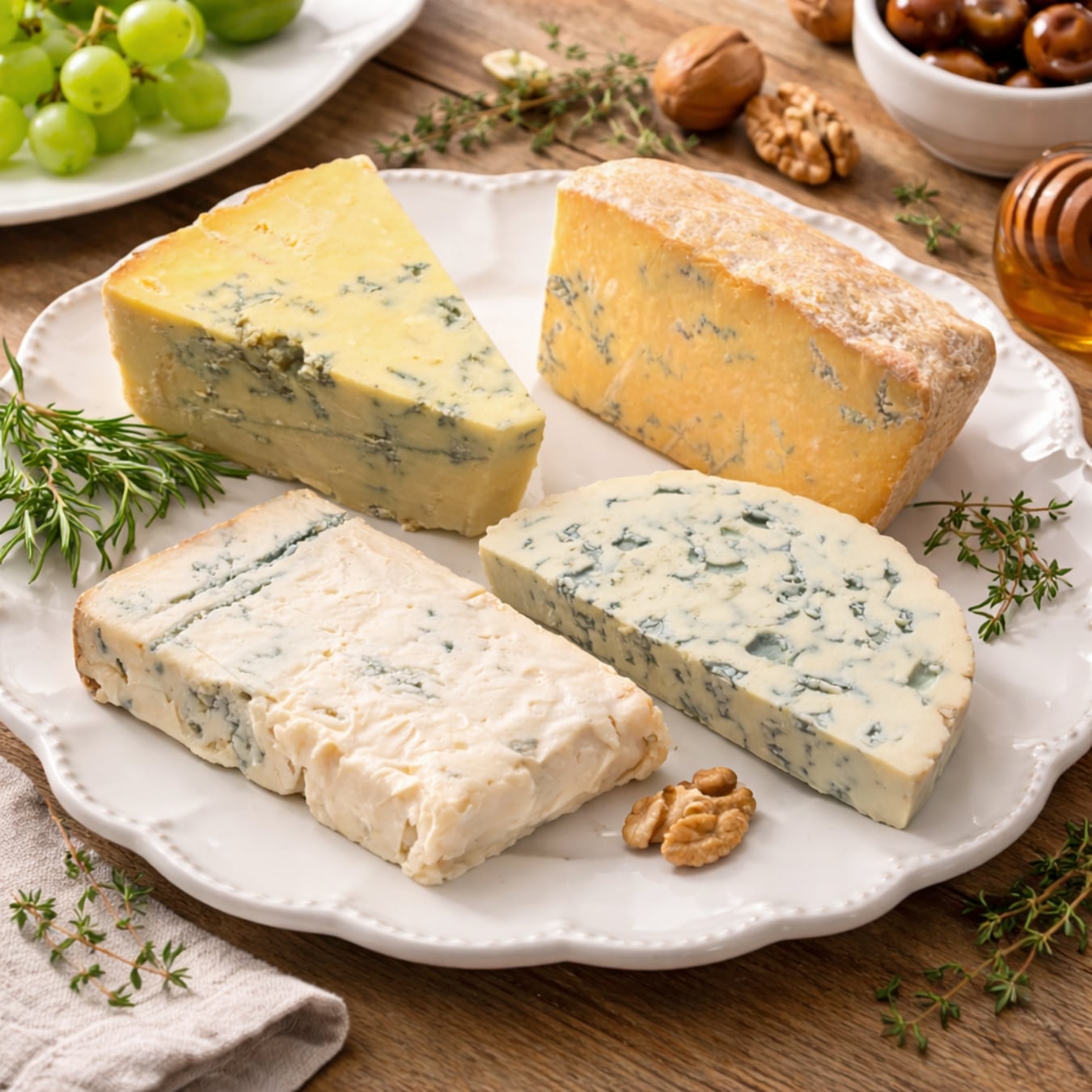 ゴルゴンゾーラ ドルチェは、クリーミーでやさしい青カビの風味が特長で、パスタやクリームソースに加えるとコクが自然に広がります。スティルトンは濃厚でねっとりとした食感があり、リゾットやソースに深みを出したいときに活躍します。シュロップシャー ブルーはコクの中にほのかな甘みがあり、サラダや前菜、チーズボードにも使いやすいタイプ。フルム ダンベールは穏やかで上品な青カビ感があり、軽めの前菜や葉物サラダにもなじみやすく、青カビチーズを料理に取り入れたい方にも扱いやすい味わいです。