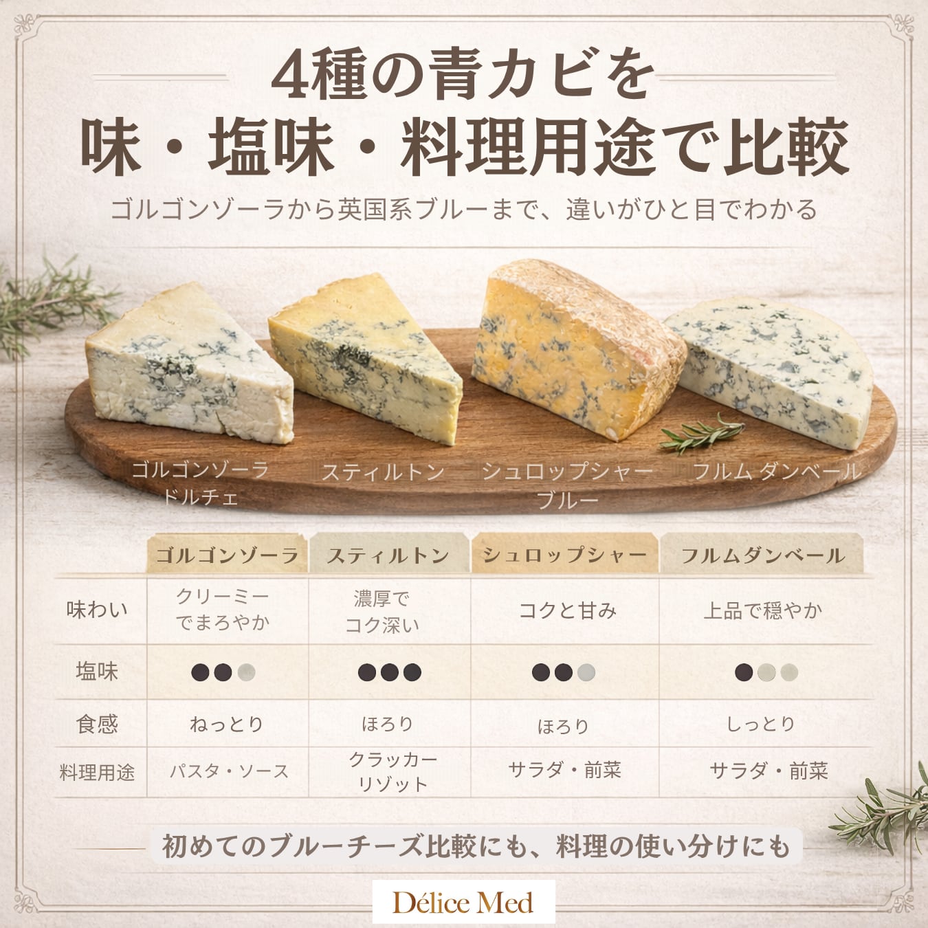 4種の中では最も上品で穏やかな印象。青カビの香りはしっかりありながら、塩味は強すぎず、ほろりと崩れる食感が料理に自然になじみます。