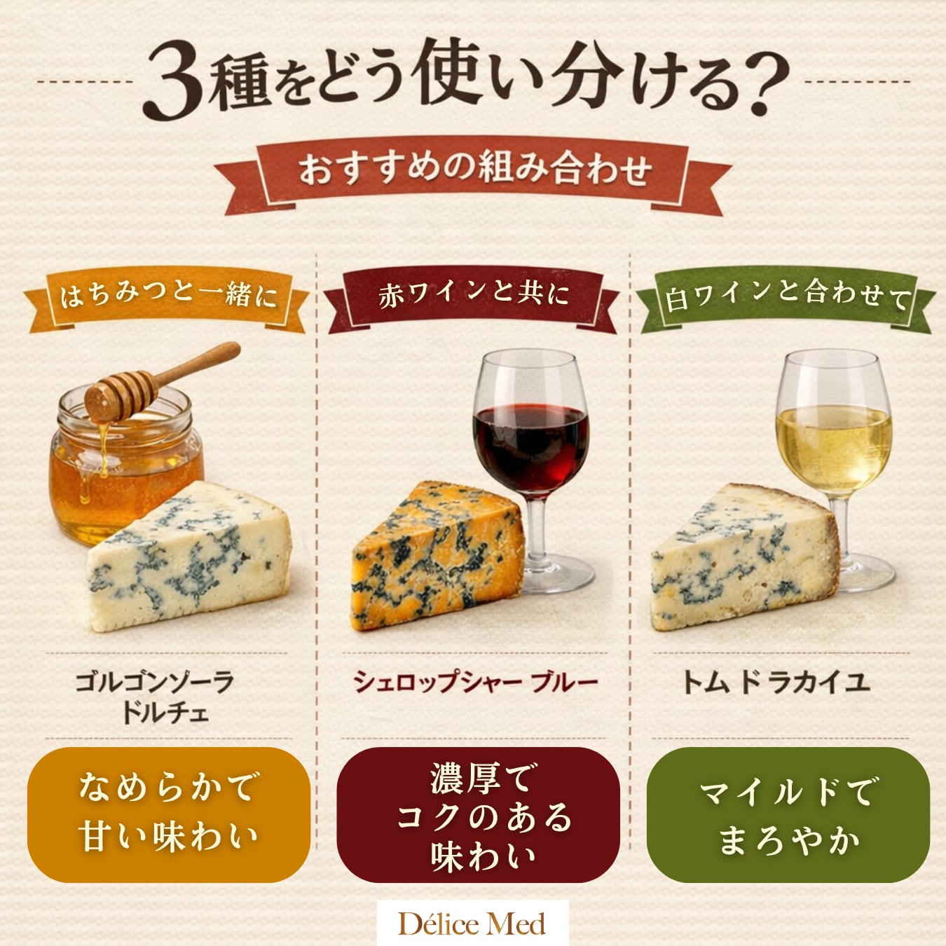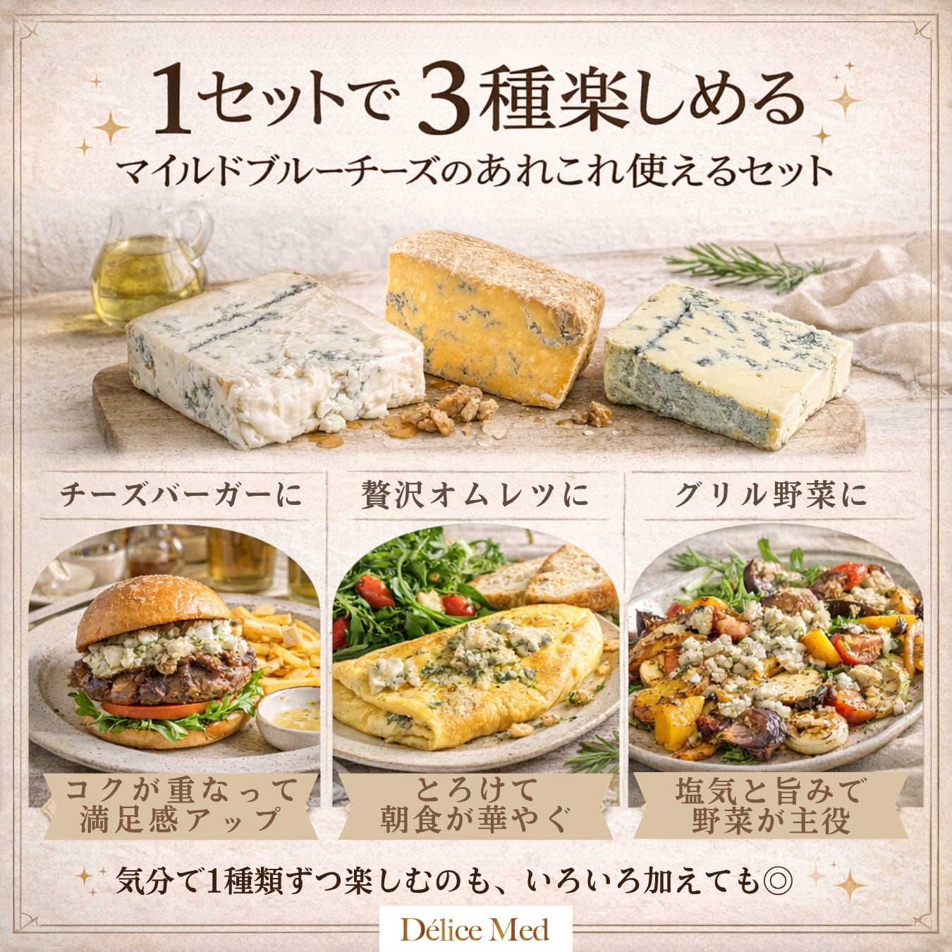 同じブルーチーズでも、ミルキーさ、コク、青カビの出方、合わせやすい食材はそれぞれ異なります。はちみつを添えてそのまま、ワイン前菜に、バゲットやサラダに、じゃがいも料理やパスタに。食べ比べながら、自分の好みや料理に合う青カビチーズを見つけたい方におすすめです。DELICEMEDらしく、素材の違いを食卓で楽しめるブルーチーズ3種セットです。