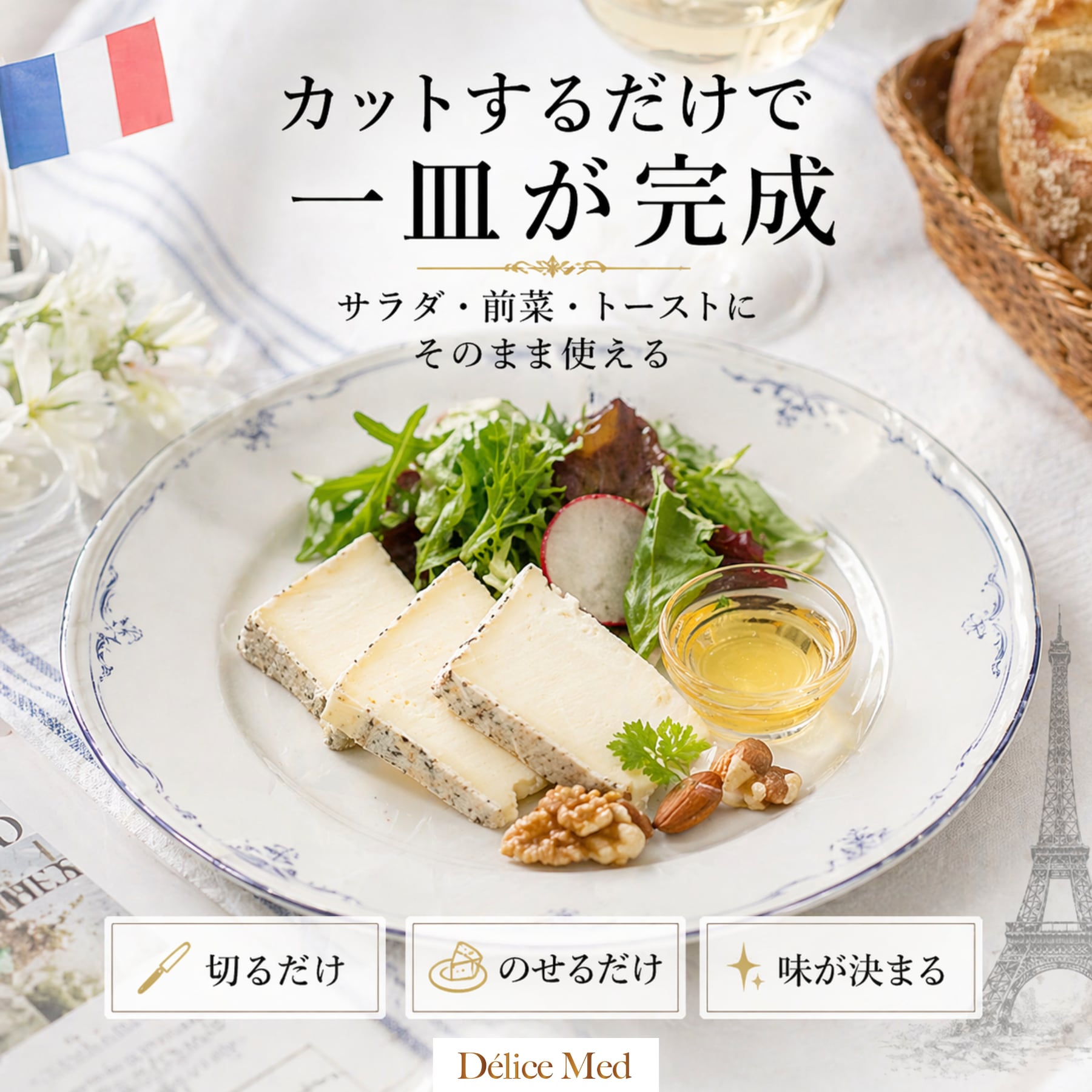 トリアングル バルビシェットは、山羊乳から作られたシェーブルチーズで、軽い酸味とクリーミーなコクが特長です。ルッコラやベビーリーフ、ナッツと合わせるだけで味がまとまりやすく、シンプルなサラダでも一皿として成立しやすい仕上がりになります。